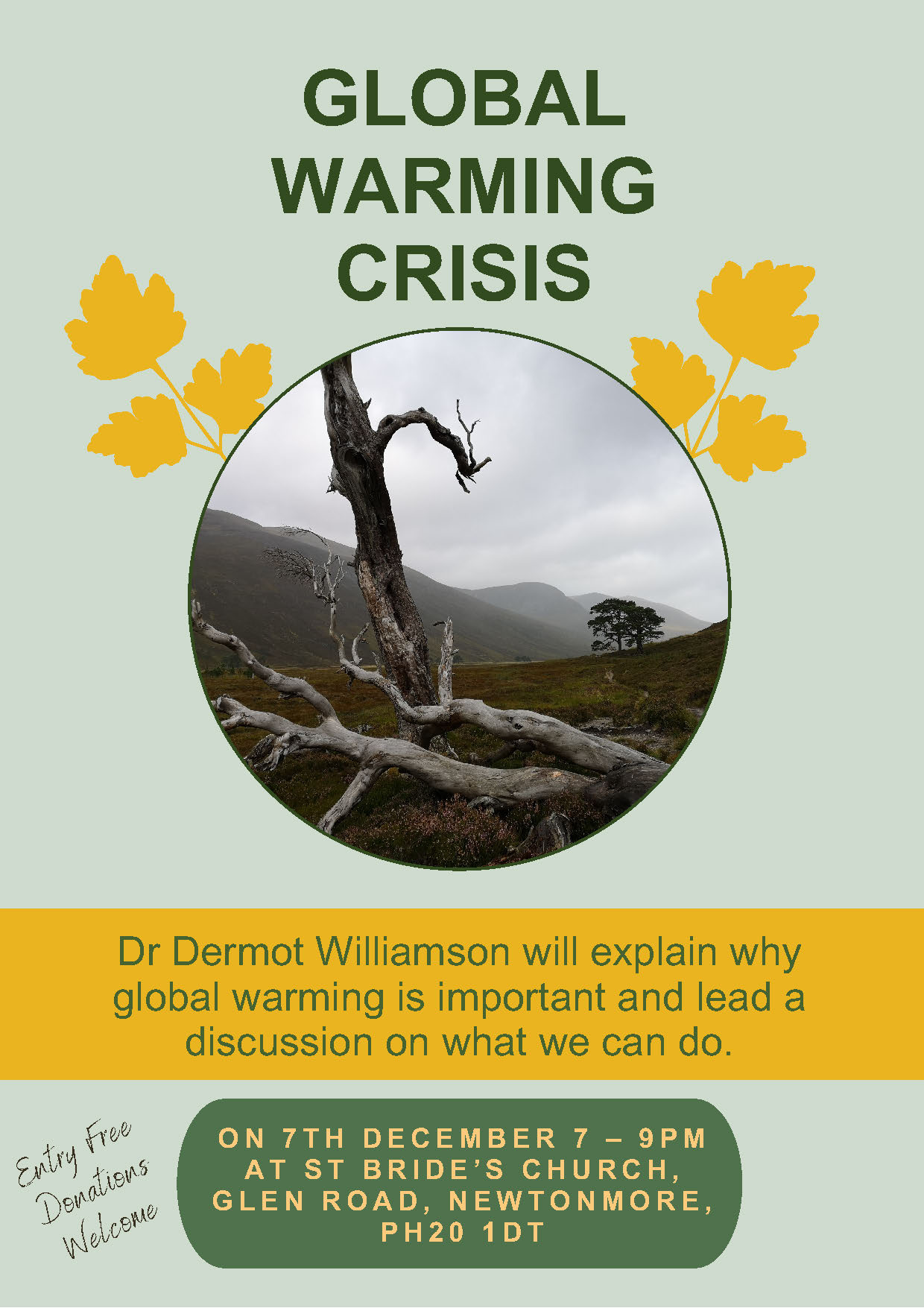 Dr Dermot Williamson talk and lead a discussion about Global Warming on Thursday, 7 December, 7 – 9 pm in St Bride’s Church, Newtonmore.