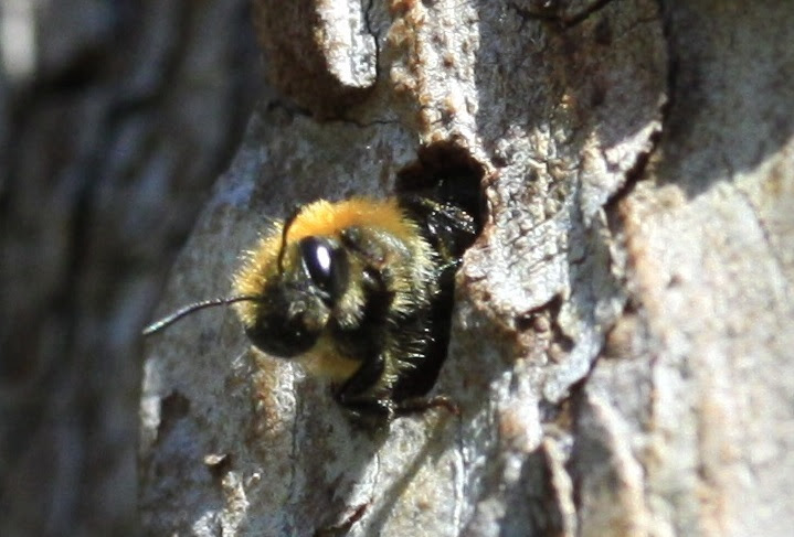 Rare pinewood mason bee Osmia uncinata emerging from a nest hole in a Scots pine snag on the threatened site. The removal of large pine trees including dead ones destroys potential nesting habitat of this Caledonian pinewood specialist. Photo credit Badenoch and Strathspey Conservation Group.