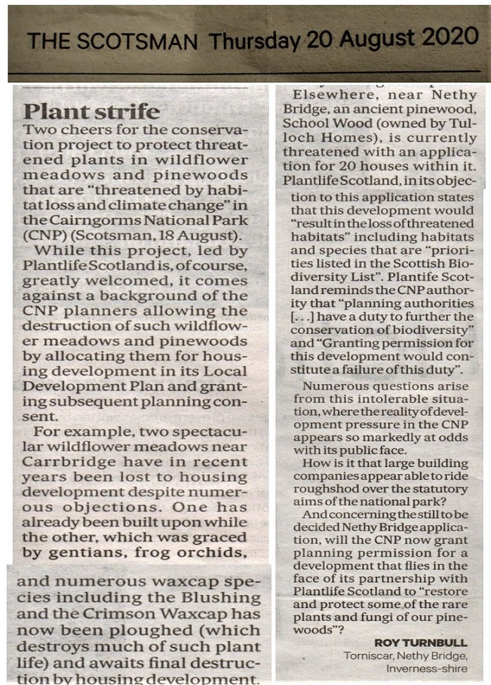 In the same week that Plantlife Scotland, with the support of the Cairngorms National Park Authority, launched this new scheme that hopes to “restore and protect some of the rare plants and fungi of our pinewoods, meadows and mountains” and, on the same day my letter appeared in the Scotsman, CNPA’s planners published their report (see here) into the application for 20 new houses in School Wood (see here for analysis on Parkswatch in April).